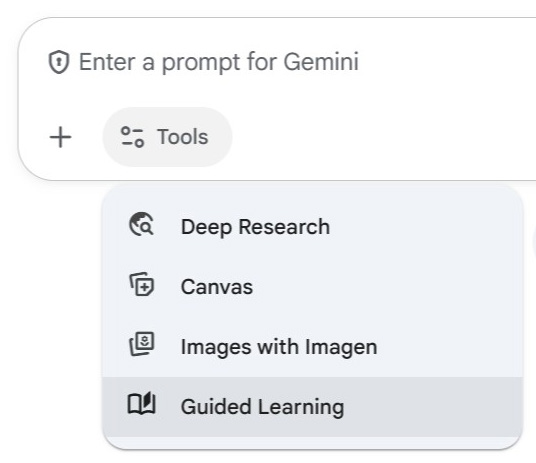 Instead of giving the answer, we want Gemini to coach the student. Click on Tools and then select the Guided Learning option.